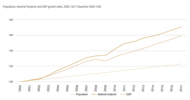 Figure 3 shows that global GDP, population, and material use have risen together, with no evidence of sustained absolute decoupling between economic growth and resource consumption.