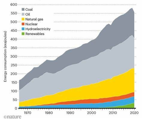 Figure 4 demonstrates the near-total dependence of global energy supply on fossil fuels, underscoring the tight link between economic activity and carbon-intensive energy sources.